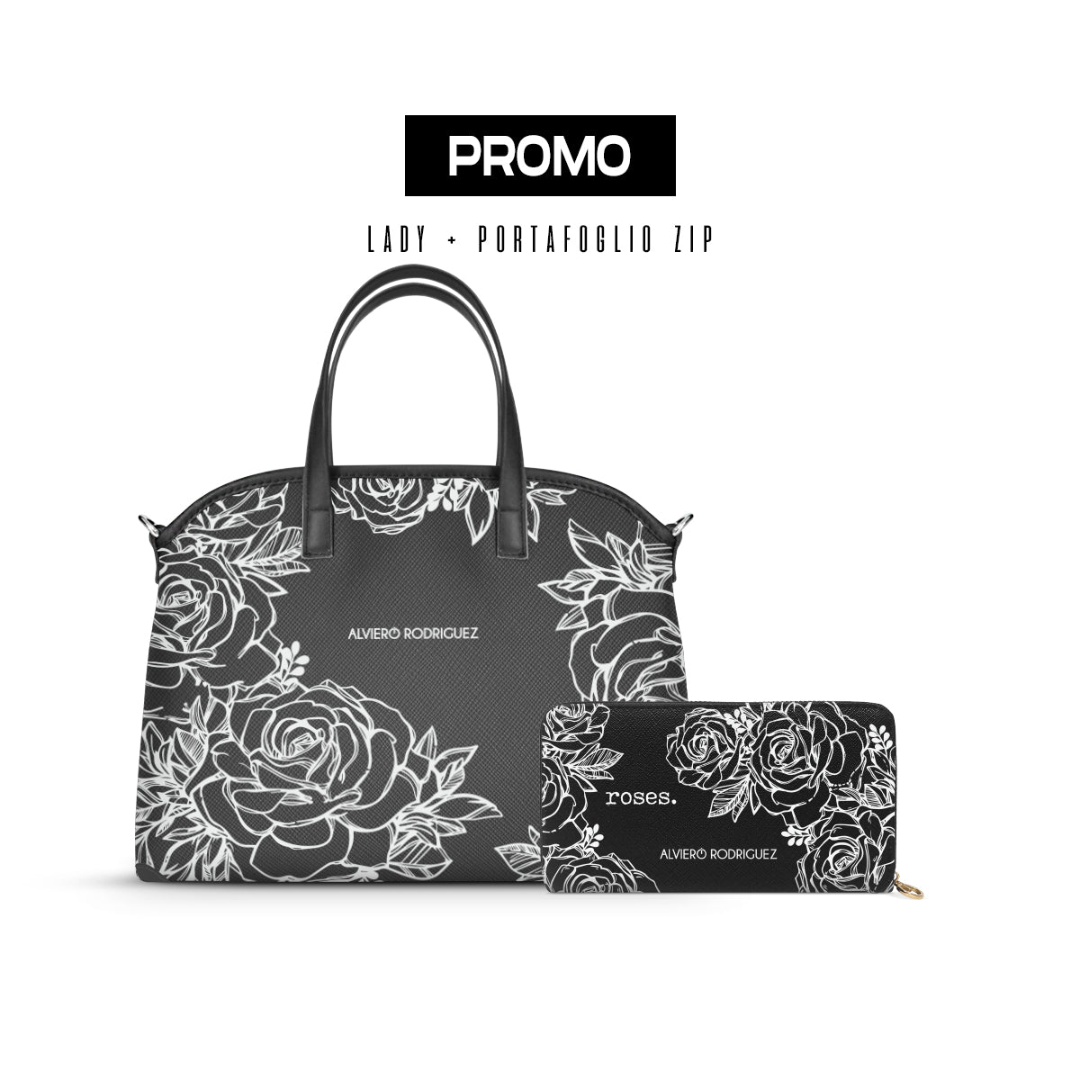La borsa lady è realizzata in ecopelle, base curvilinea e apertura con zip, rifinita con metalli color argento. La stampa è presente fronte/retro. Pratica, comoda e spaziosa avendo inoltre la possibilità di portarla a tracolla.
