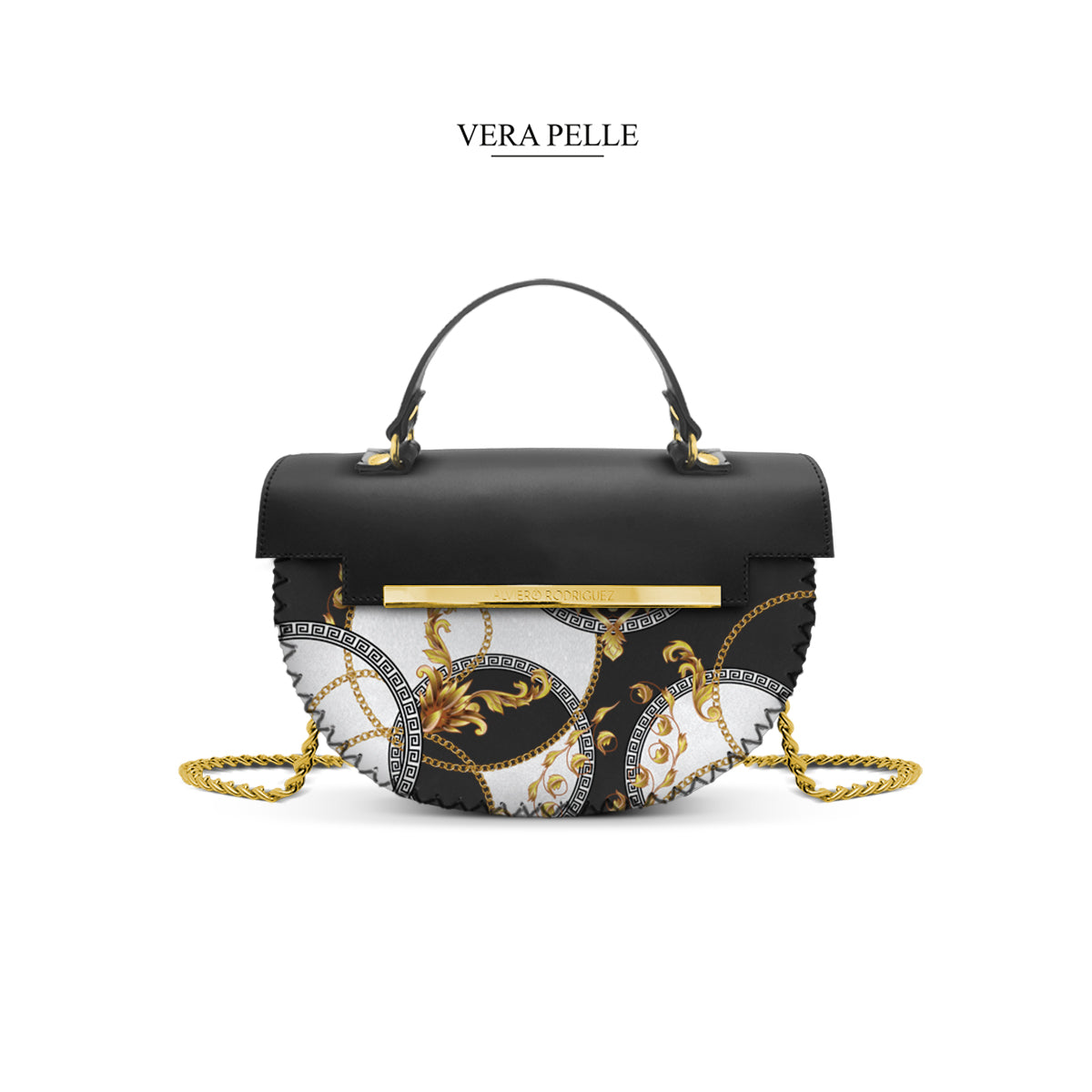 Le dimensioni della borsa sono di 24x17x7 e la sua forma insolita e irregolare la rende raffinata e chic,unita dalla presenza del manico per portarla a mano o a braccio,della catenina oro da mettere a tracolla e la particolare pattina con la placca in oro in cui è inciso il marchio.