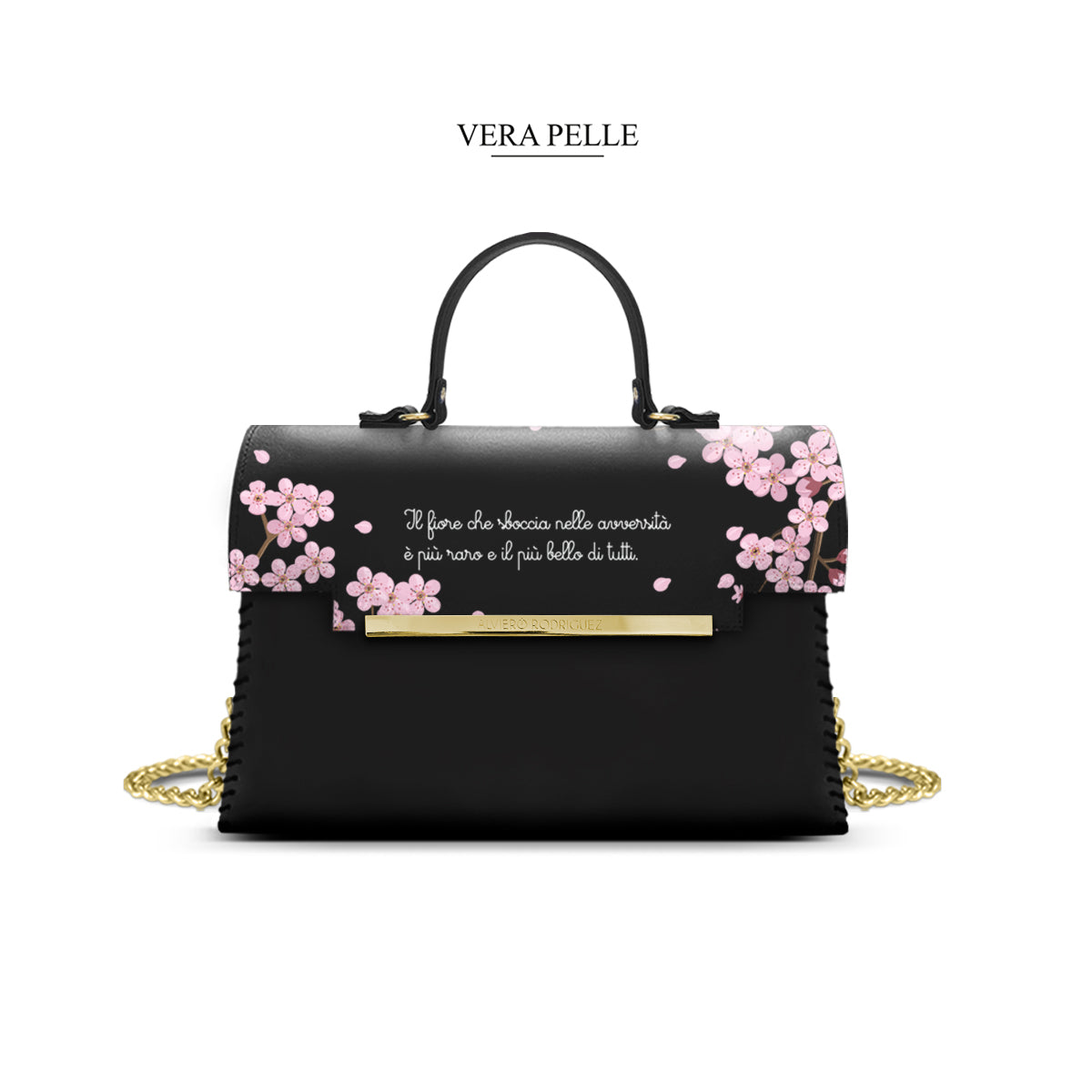 Interamente realizzata in pelle di alta qualità,la tiffany presenta una pattina con chiusura a calamita e placca in acciaio,il manico per chi desidera indossarla a mano o a braccio,per coloro che,invece,optano per la comodità possono tranquillamente inserire una graziosa tracolla in catena oro disponibile con la borsa.